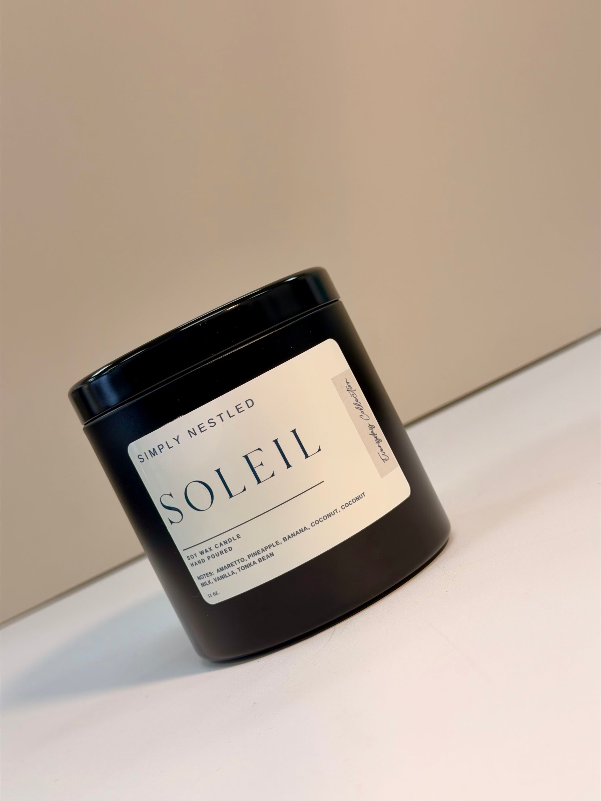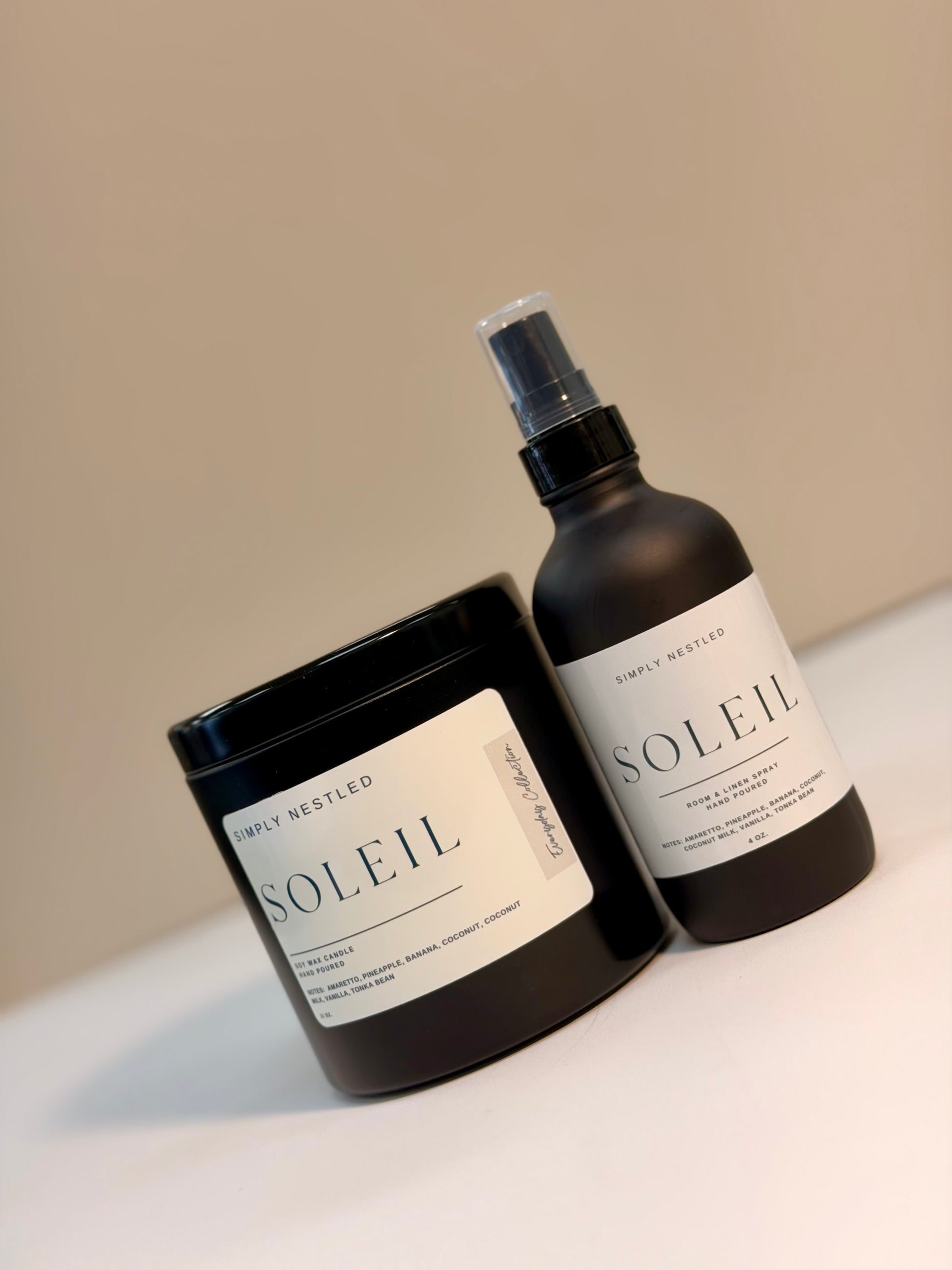 Let’s get nestled into my Soleil candle! This 100% soy candle is hand poured into 11 oz., 4 oz. black tin, and room spray featuring non toxic clean fragrance.